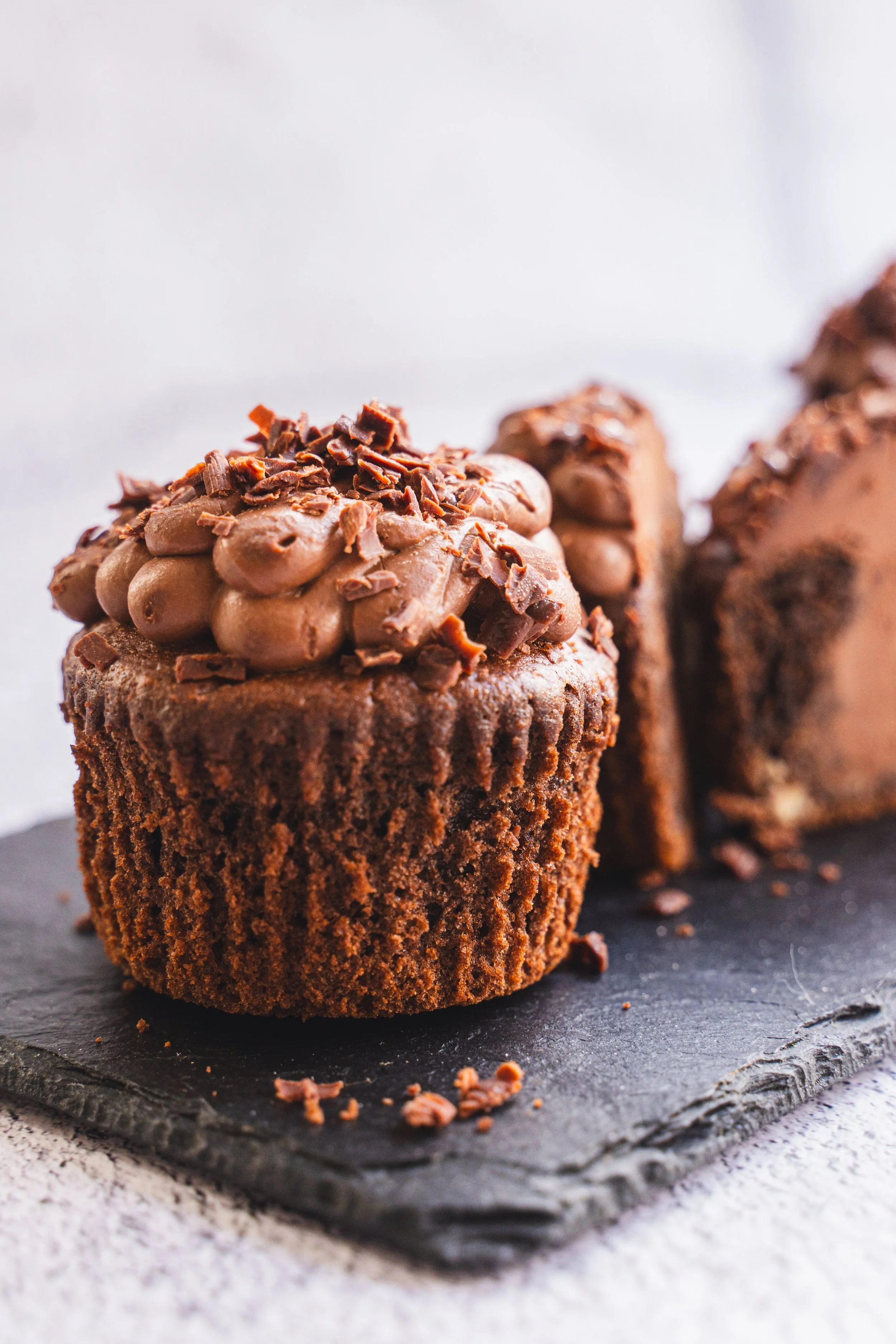 Once the muffins have cooled, fill with the ganache and pipe over the top.