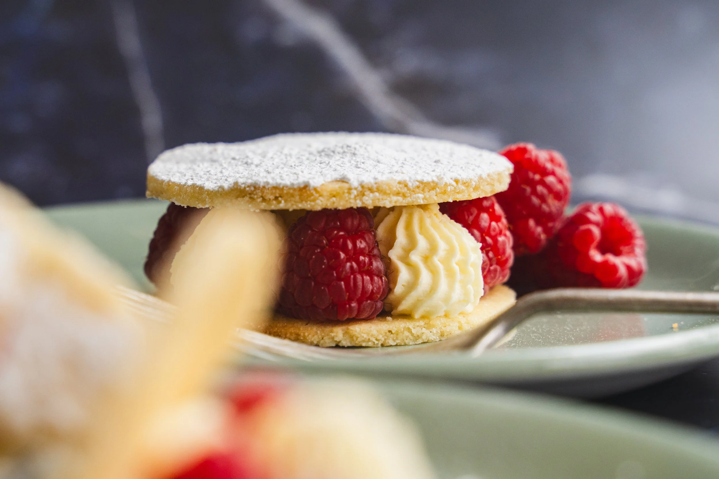 Once your biscuits are baked and cooled whip up the cream and pipe on one half of the biscuit pair. Finish with raspberries before topping with the second biscuit, dusting with icing sugar and serving.
