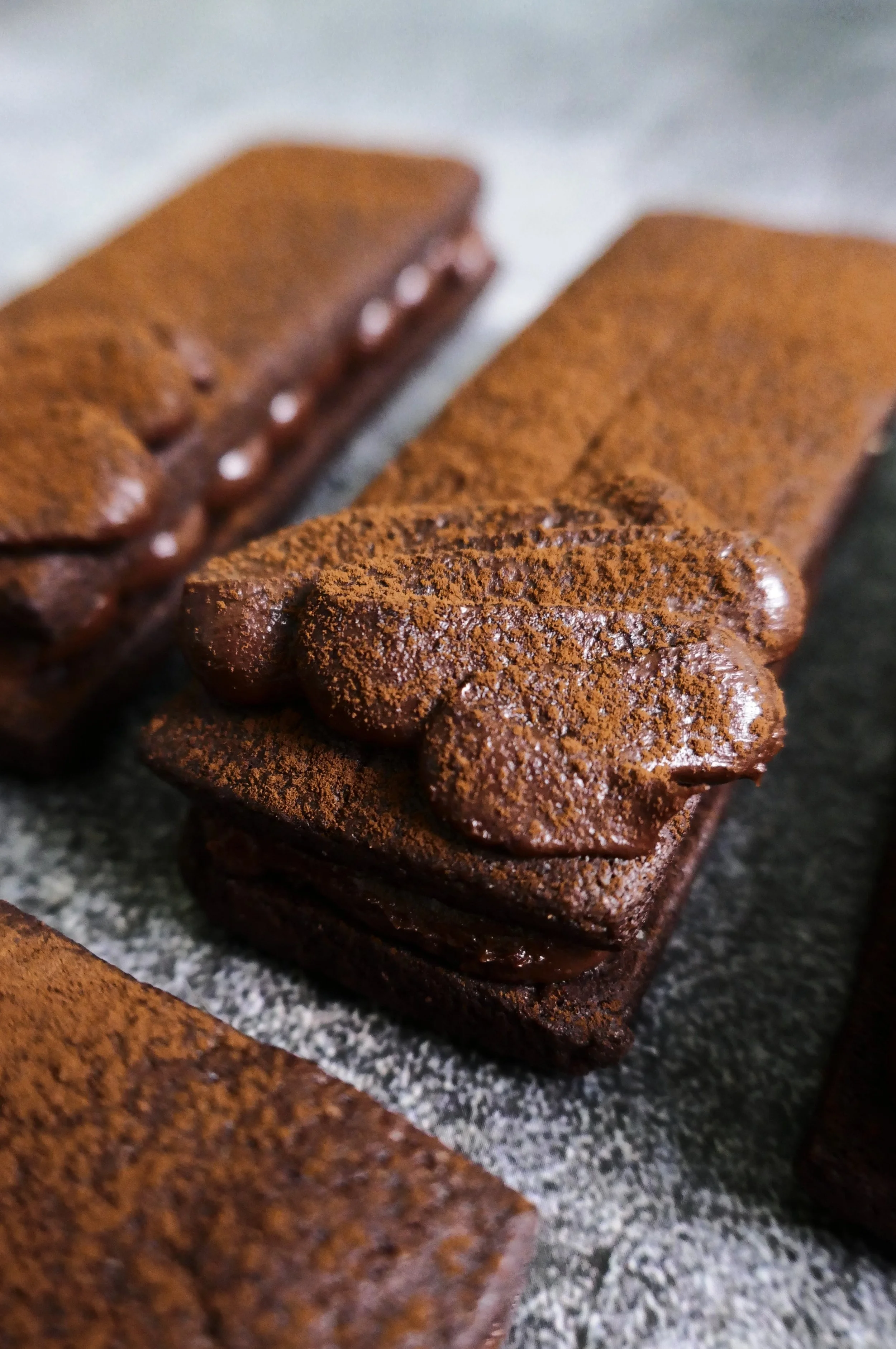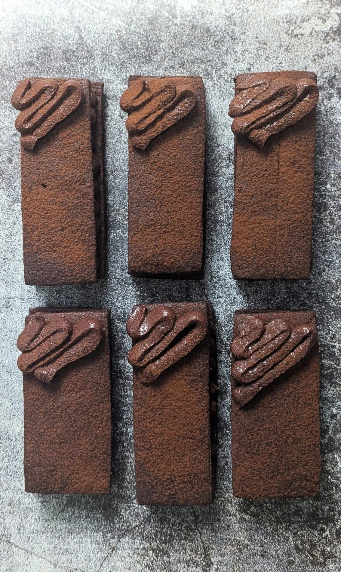 Finish with any left over ganache you may have a dusting of cocoa powder for good measure!