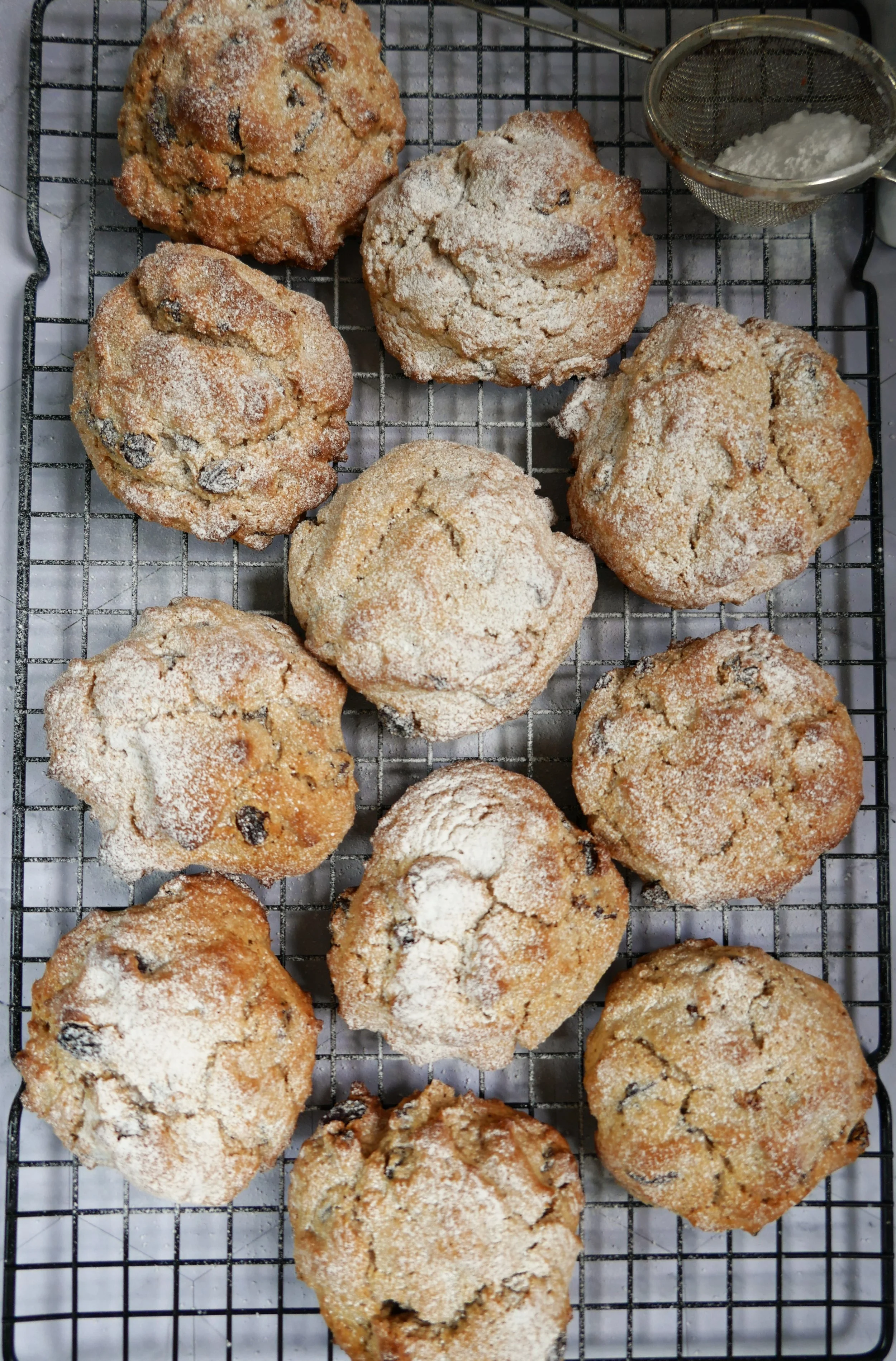 Finish the dough by breaking up and mixing with the milk, pour this slowly into the dry ingredients until you have a tacky almost cake-like dough. Portion into 12 rock cakes (I used an ice-cream scoop to initially help to divide the mixture evenly).