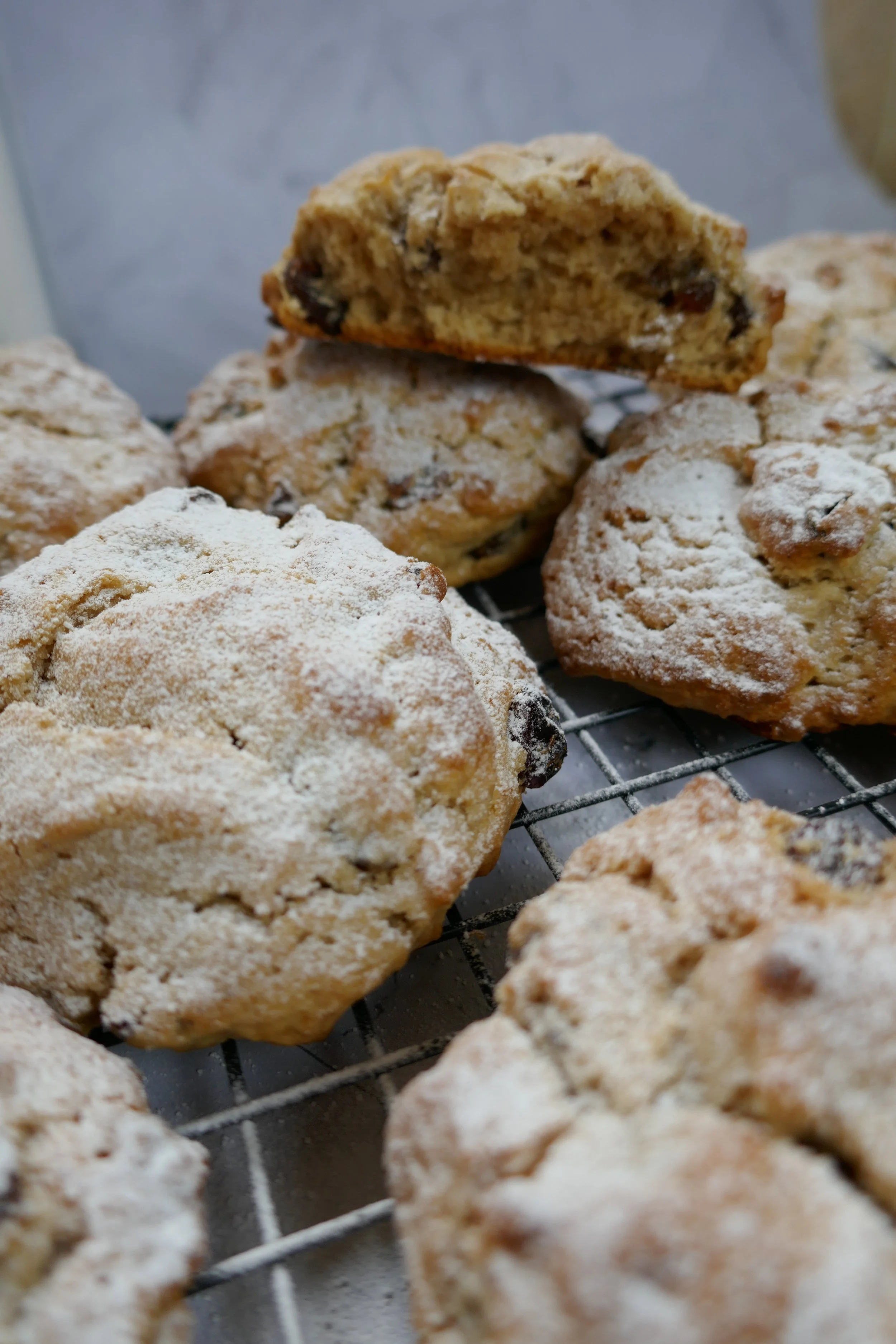 Mix the dry ingredient together, removing any lumps . Sand the butter into the dry ingredients until no lumps of butter are visible. Fold through the raisins (or other dried fruit if using).