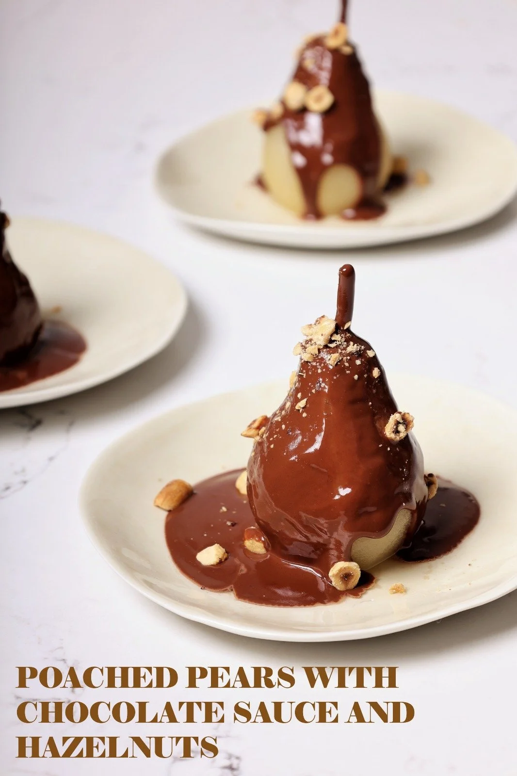 POACHED PEARS WITH CHOCOLATE SAUCE AND HAZELNUTS